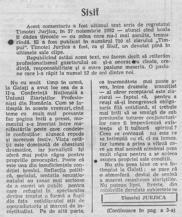 Acest comentariu a fost ultimul text scris de regretatul Timotei Jurjica, în 27 noiembrie 1992 – atunci cînd boala îi dădea tîrcoale – cu mîna care nu-l mai asculta, tremurîndă. El a fost publicat în numărul 750 al ziarului „Timpul”. Timotei Jurjica a fost, ca şi Sisif, un devotat pînă în ultimele sale clipe.