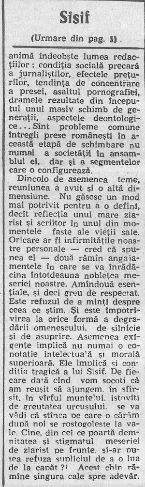 Dincolo de asemenea teme, reuniunea a avut şi o altă dimensiune. Nu găsesc un mod mai potrivit pentru a o defini, decît reflecţia unui mare ziarist şi scriitor în unul din momentele faste ale vieţii sale. Oricare ar fi infirmităţile noastre personale – cred că spunea el – două rămîn angajamentele în care se va înrădăcina întotdeauna nobleţea meseriei noastre. Amîndouă esenţiale, şi deci greu de respectat. Este refuzul de a minţi despre ceea ce ştim. Şi este împotrivirea la orice formă a degradării omenescului, de silnicie şi de asuprire. Asemenea exigenţe implică nu numai o conotaţie intelectuală şi morală superioară. Ele implică și condiţia tragică a lui Sisif. De fiecare dată cînd vom socoti că am reuşit să ajungem, în sfîrșit, în vîrful muntelui, istoviți de greutatea urcuşului, se va vădi că stînca pe care o cărăm după noi se rostogoleşte la vale. Cine, din cei ce poartă demnitatea şi stigmatul meseriei de ziarist pe frunte, şi-ar putea refuza supliciul de a o lua de la capăt? Acest chin rămîne singura cale spre adevăr.